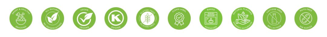 Todos nuestros productos son naturales, veganos, libres de químicos, horneados, Gluten Free, Kosher y libres de alérgenos. Los puedes encontrar a nivel nacional en las principales cadenas de supermercados del país.